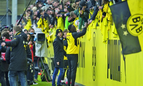 Some 1,500 people were in the stands of Dortmund’s training ground in the suburb of Brackel for the morning session and dozens of reporters and camera crews were spread along the sideline as Bolt entered the pitch alongside players Mario Goetze and Julian Weigl.