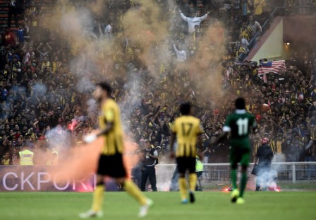 Militant ‘Ultras Malaya’ fans who had earlier threatened to disrupt the game hurled flares billowing orange smoke towards the pitch in the final minutes, as the hosts trailed 2-1 in the Group A match.