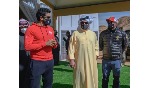 HH Shaikh Nasser bin Hamad Al Khalifa, Representative of HM the King for Humanitarian Works and Youth Affairs, has witnessed in the presence of HH Shaikh Khalid bin Hamad Al Khalifa, First Deputy President of the Supreme Council for Youth and Sports, President of the General Sports Authority, President of the Bahrain Olympic Committee, and HH Shaikh Faisal bin Rashid Al Khalifa, Vice President of the Supreme Council for the Environment and Vice President of the High Committee of the Rashid Equestrian and Horse Racing Club, the final preparations for the Royal Endurance Team ahead of the Custodian of the Two Holy Mosques Endurance Cup which will take place on Saturday in Al Ula, Saudi Arabia.