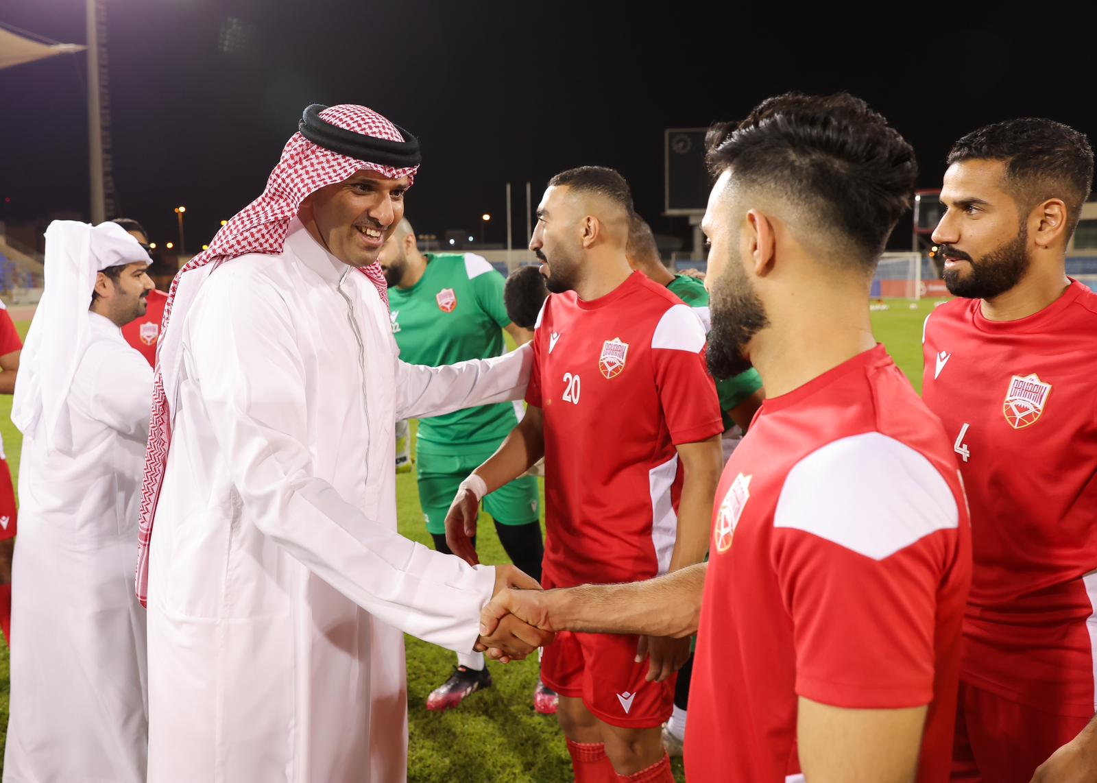 BFA president Shaikh Ali bin Khalifa bin Ahmed Al Khalifa visited the national team’s training session at the match venue, accompanied by BFA vice-president His Highness Shaikh Khalifa bin Ali bin Isa Al Khalifa and BFA secretary general Rashid Al Zoubi.