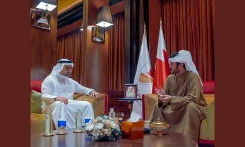 His Highness Shaikh Khalid bin Hamad Al Khalifa, First Deputy Chairman of the Supreme Council for Youth and Sports (SCYS), Chairman of the General Sports Authority (GSA) and President of the Bahrain Olympic Committee (BOC), received Abdullah bin Adel Fakhro, Minister of Industry and Commerce.