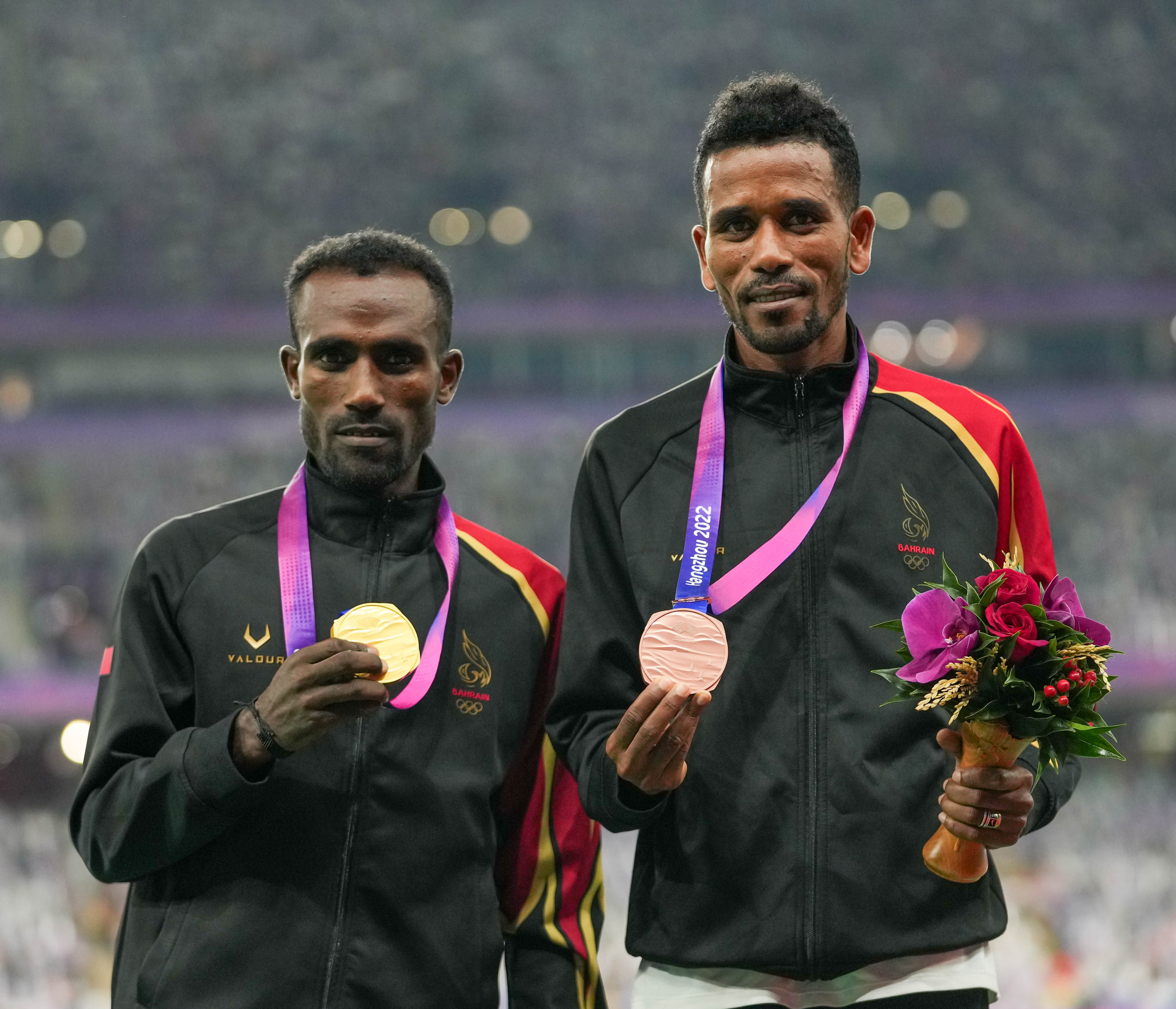 Bahrain’s Birhanu Balew, left, and Dawit Fikadu with their medals