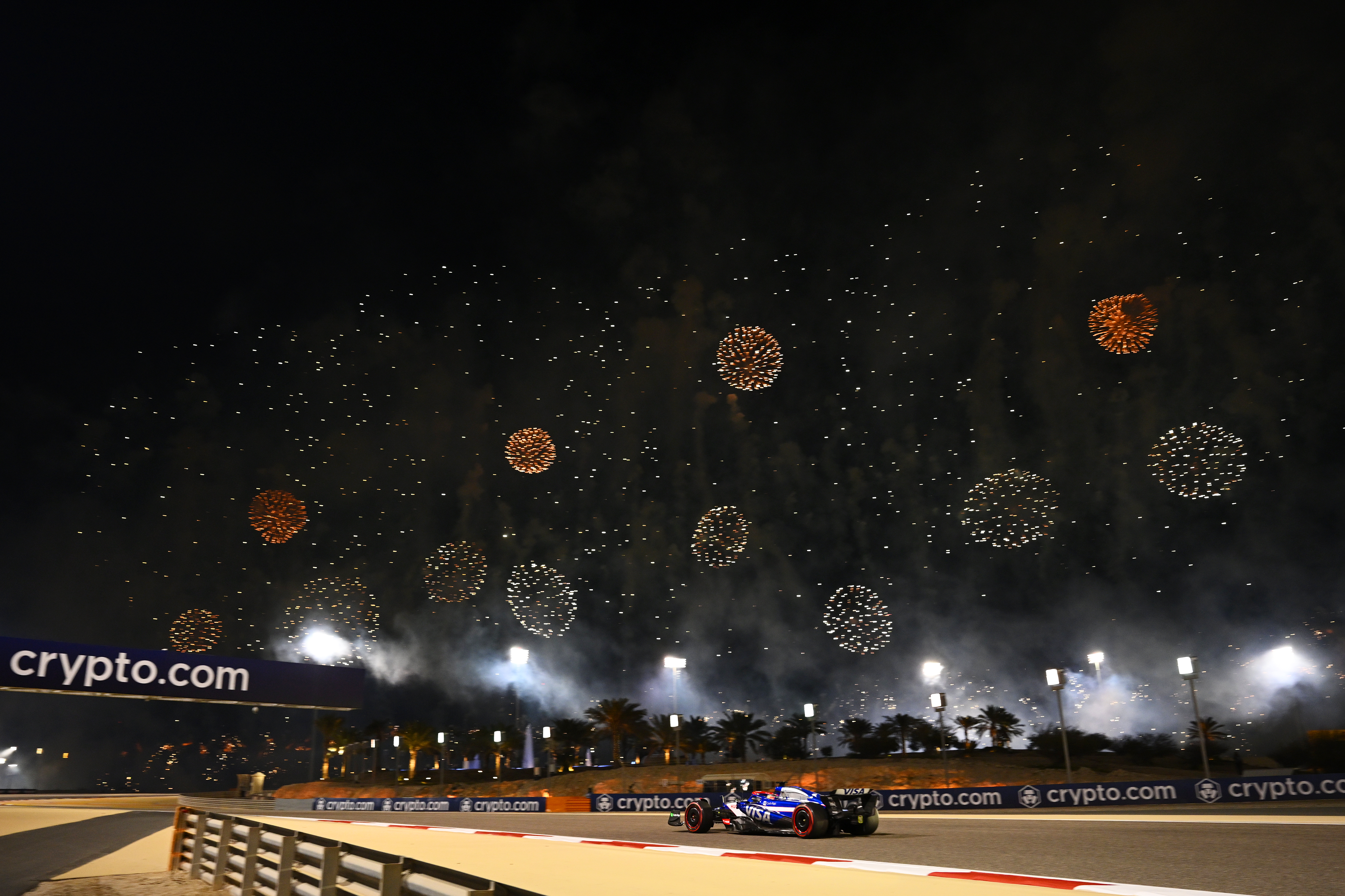 Yuki Tsunoda in his RB contender on his way to the chequered flag as the fireworks light up the night sky at BIC