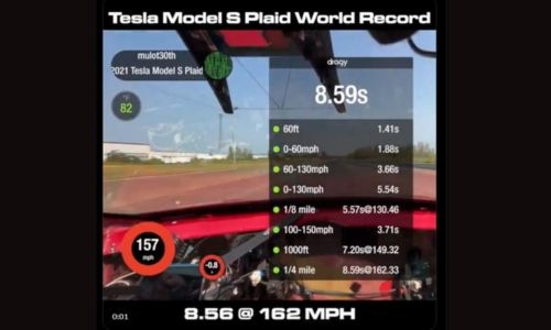 The Tesla Model S Plaid has set a new quarter-mile record with a time of 8.56 seconds.