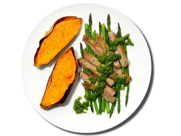 03 While the steak is cooking, trim the asparagus and drop it in the same pan to cook. When tender, serve with the sweet potato, sliced down the middle into two. Cut the steak into strips, serve on top of the asparagus and pour over the green sauce.