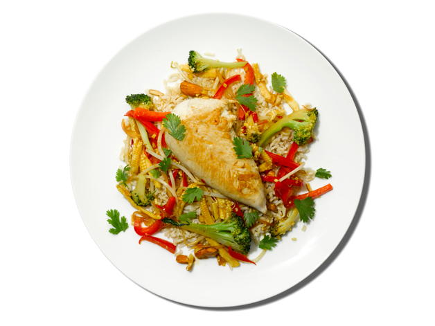 03 Keep moving everything around in the wok for an even cook – once the veg starts to soften and the meat is done, serve on top of the rice and pour over the remaining juices and a squeeze of lime. Top with almonds and devour.