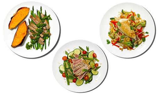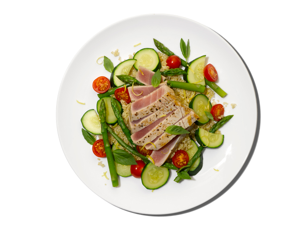 03 Cook the tuna for 60sec per side – or longer if you prefer it cooked through, but it’s best rare. Pile the quinoa on your plate with the tomatoes, asparagus and courgette; slice the tuna and layer on top. Garnish with basil and a squeeze of lemon.