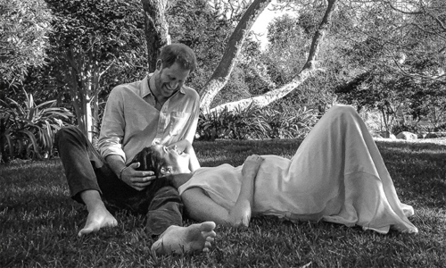 The couple shared a black and white photo of themselves under a tree, with Meghan resting her hand on Harry's leg while holding her tummy.
