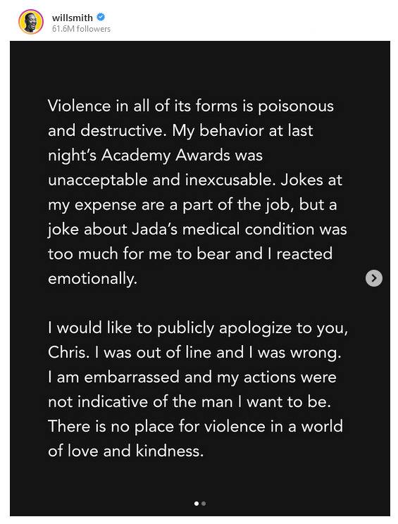 Smith, in a post on Instagram, said his behaviour at the televised ceremony was "unacceptable and inexcusable."