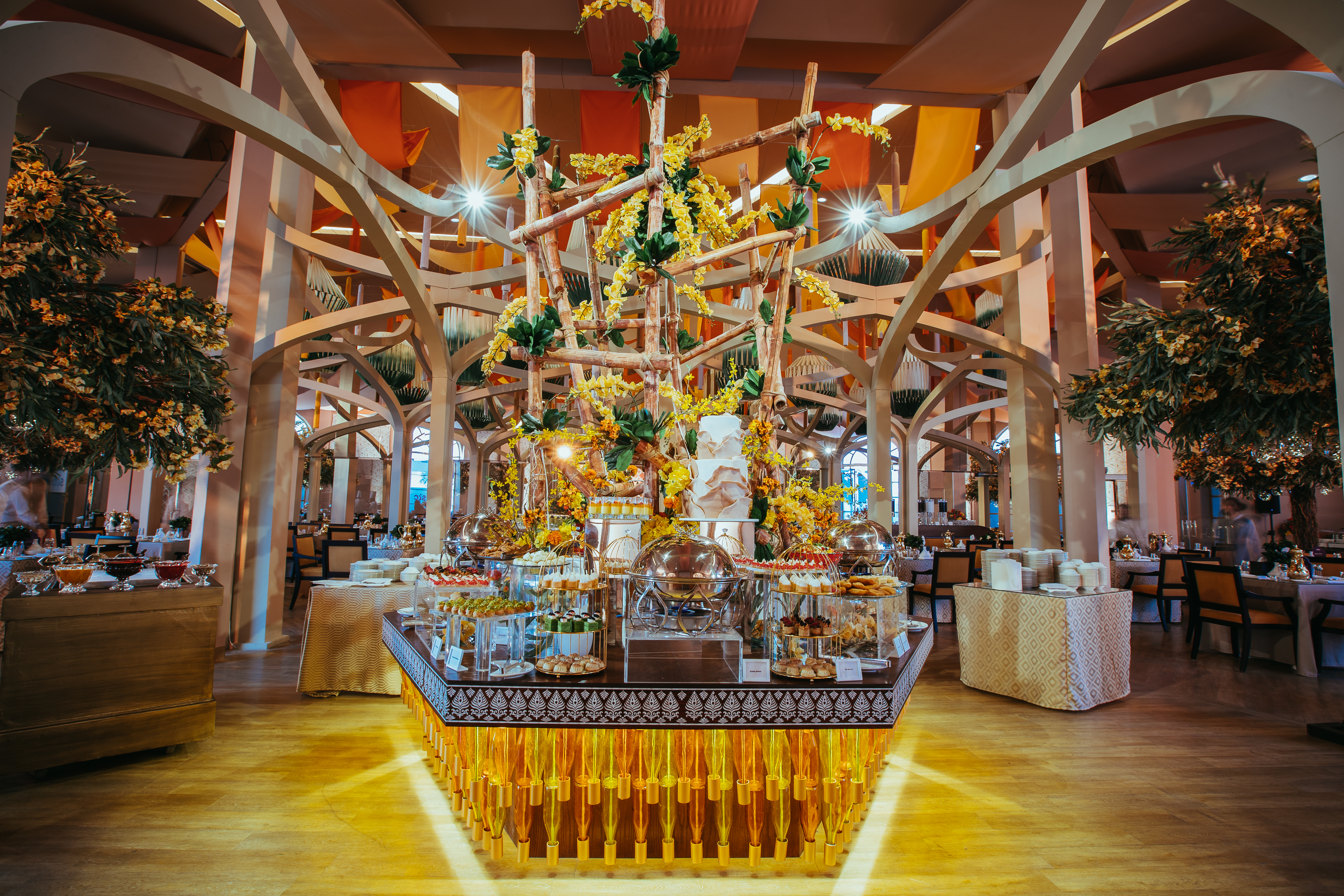Elegant flower arrangements adorned the buffet area. I was immediately seated. I noticed the meticulous care with which each table was set up with a fresh plant, two golden flasks filled with tea and gahwa (Arabic coffee) so that you don’t have to keep looking for a server every time you want to sip on tea or gahwa.