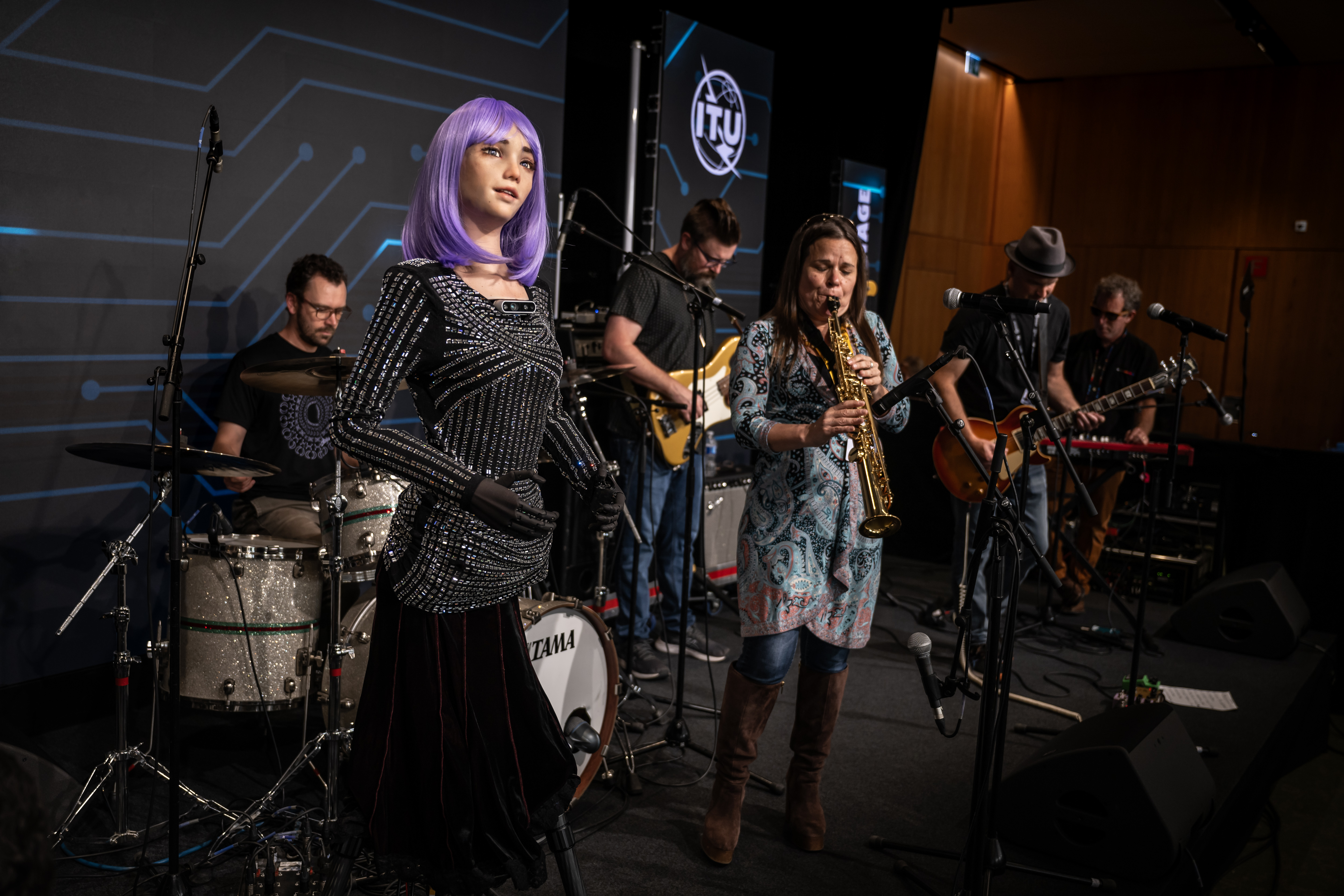 “I don’t believe in limitations, only opportunities,” said Desdemona, who sings in the Jam Galaxy Band. Robot artist Ai-Da said many people were arguing for AI regulation, “and I agree”.