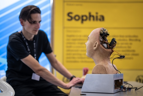 They were assembled for what was billed as the world’s first press conference with a packed panel of AI-enabled humanoid social robots.