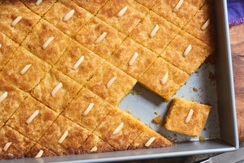 Namoura, a cake made from semolina flour, is soaked in syrup while it’s still warm. The cake has no eggs, but this version gets its rich flavor and texture from aerated yogurt, which goes bubbly within minutes of being mixed with a little baking soda.