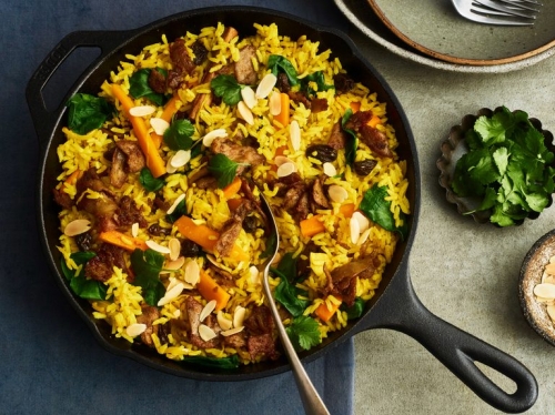 2. Stir in the rice and raisins and shake the pan so everything flattens out. Crumble the stock cube in-to the pan and add enough just-boiled water to come 1cm above the level of the rice. Bring to the boil, then cover with a lid and lower the heat. Cook for 10-12 mins or until the rice is tender and the stock absorbed.