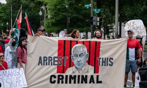 “Arrest that war criminal,” read another. Palestinian and Jewish organizers stood on a stage and denounced both the United States and the Israeli government for “genocide,” calling for a “citizen’s arrest” of Netanyahu.