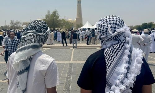 Many Doha mourners wore scarves that combined the Palestinian flag with a checkered keffiyeh pattern and the message in English: “Free Palestine”.