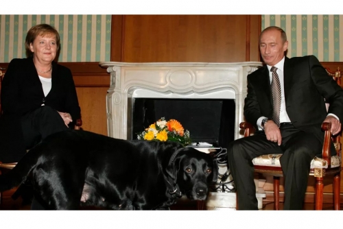 Images from their 2007 meeting in the Russian city of Sochi showed Putin’s black Labrador Retriever Konni sniffing around while the German leader sat in her chair, smiling nervously.