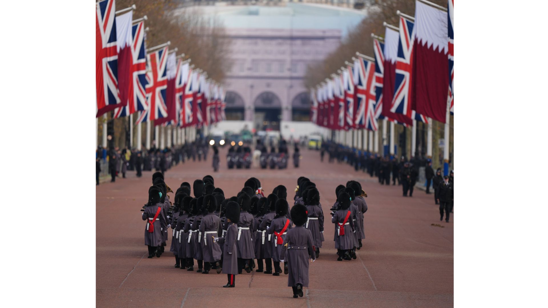 Britain’s King Charles III warmly welcomed Qatar’s Emir Sheikh Tamim bin Hamad al-Thani during a ceremonial event at Horse Guards Parade in London on December 3, 2024. The Emir, accompanied by his wife, began a two-day State Visit to the UK aimed at deepening diplomatic and economic relations.