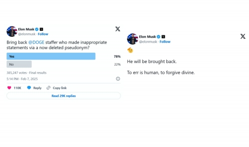 Elon Musk has reinstated Marko Elez, a former Department of Government Efficiency (DOGE) employee, after a viral controversy involving his racist social media posts. Elez, who resigned following public backlash, had previously shared offensive remarks about Indian and Middle Eastern people. Musk conducted a poll on X, asking followers whether Elez should be rehired. The poll showed overwhelming support for his return, with 78% voting in favor. Musk followed up with the statement, "To err is human, to forgive divine."