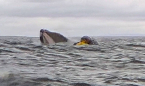 “It seems that the kayak was right in the whale’s feeding patch,” said marine biologist Maria Jose Perez of the University of Chile, “which is why it was seen emerging to the surface sideways, with its mouth open.”