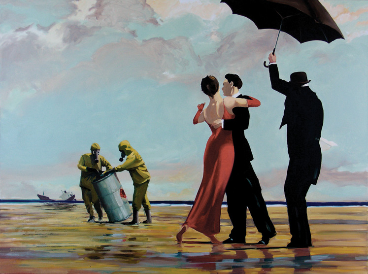 Vettriano's "Singing Butler" depicts a couple in evening dress dancing on a windswept beach accompanied by a butler and a maid holding umbrellas. It set a Scottish record when it was sold at auction in 2004 for £744,800.