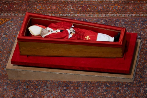 Dressed in his papal vestments -- a red chasuble, white mitre and black shoes -- and with a rosary laced between his fingers, the pope’s body has been laid out in a red-lined wooden coffin.