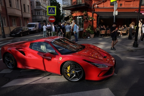 A red Ferrari glides by as techno music blasts from fancy bars full of dressed-up revellers sipping ice-cold spritz. The party is in full swing in Moscow's posh Patriarch Ponds neighbourhood.