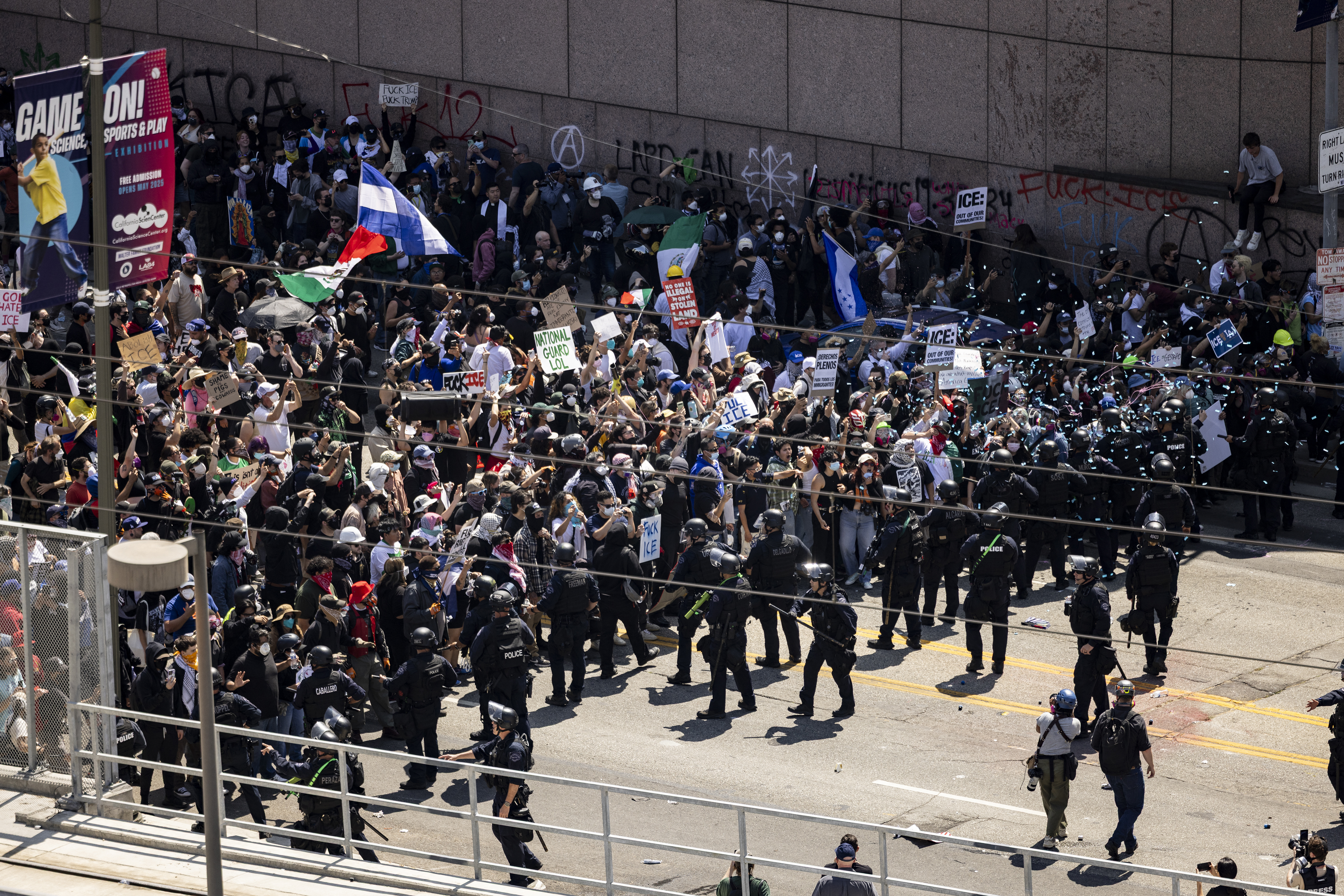 Los Angeles Police Department (LAPD) officers set up containment lines to keep demonstrators separated from armed National Guardsmen from the 79th Infantry Brigade Combat Team in helmets and camouflage gear.