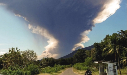 A volcano in eastern Indonesia erupted on Monday spewing a colossal ash tower 18 kilometres (11 miles) into the sky, authorities said, just weeks after it caused dozens of flight cancellations to and from the popular resort island of Bali.