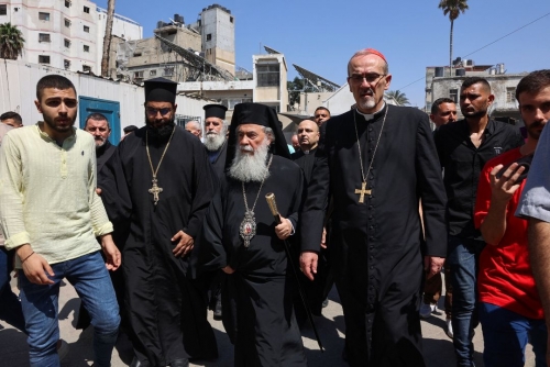 The Roman Catholic Latin Patriarch of Jerusalem, Pierbattista Pizzaballa, and his Greek Orthodox counterpart, Theophilos III, greeted local Christians and toured the Holy Family Church in Gaza City.