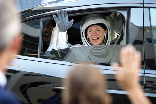NASA astronaut and mission commander Zena Cardman waves to family members before heading to the launch pad at the Kennedy Space Center in Cape Canaveral, Florida.