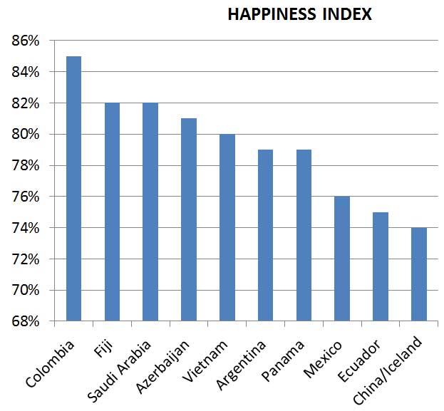 The happiest country in the world is Colombia, and the unhappiest country is Iraq.