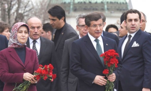 Photo Caption :Turkey’s Prime Minister Ahmet Davutoglu, right, accompanied by his wife Sare, left, visits the site of Tuesday’s explosion in the historic Sultanahmet district of Istanbul, Wednesday. — AP