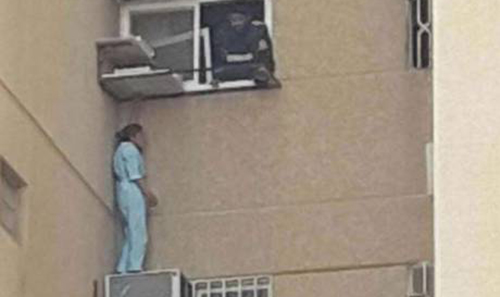 The helper reportedly sneaked out of the room window on the sixth floor of a building in Al Midhar Residential Complex and stood on an air conditioning unit, threatening to jump to the ground.