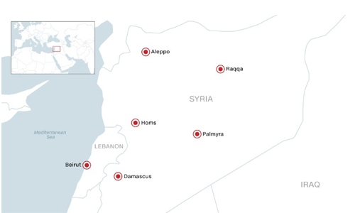 In a 24-hour journey, it travels from Beirut, across the border to regime-held Damascus. Then it heads to Palmyra, held by ISIS, before moving north toward Raqqa.