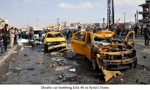 At least 46 people were killed and dozens injured on Sunday in a double car bomb attack in the central Syrian city of Homs, a monitor said.