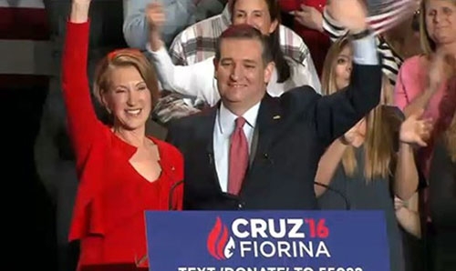 Washington: White House hopeful Ted Cruz went all-in Wednesday as he sought to bar Donald Trump's triumphant march to the Republican nomination, naming Carly Fiorina as his running mate as the primary race hits its final stretch.