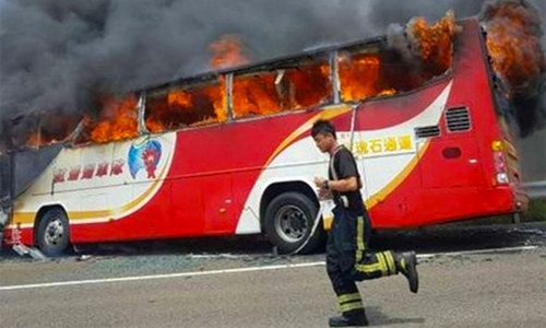 Taipai : A fire ripped through a bus carrying tourists from China in Taiwan Tuesday, killing all 26 on board in the worst road accident to hit mainland visitors since a holiday boom to the island.
