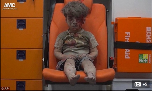 Covered in dust from the rubble which was once his home, one side of Omran Daqneesh's face is drenched in blood, his expression dazed.