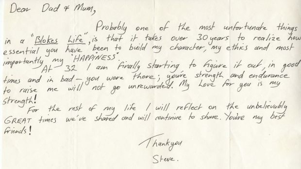 “Probably one of the most unfortunate things in a ‘Bloke’s Life’ is that it takes over 30 years to realise how essential you have been to build my character, my ethics and, most importantly, my HAPPINESS,” the note, in part, reads. “At 32, I am finally starting to figure it out. In good times and in bad, you were there. Your strength and endurance to raise me will not go unrewarded.”