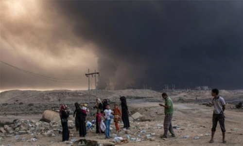 Qayyarah : The smoke from fires lit by Islamic State jihadists to provide cover from air strikes has painted the northern Iraqi sky black, providing a dramatic backdrop for the Mosul offensive.