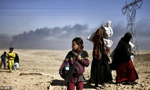 Mosul : Hundreds of civilians fled through the desert Tuesday to escape fighting and privation in Mosul, joining thousands of others who left their homes as conditions worsen in the city's west.