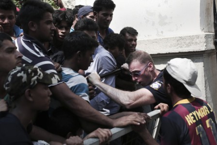 A video frame grab posted by Greek media show the officer, who is holding a knife, slap the migrant outside the Kos police station.Scores of migrants are standing outside the station, waiting to be documented so that they can sail on to Athens.
