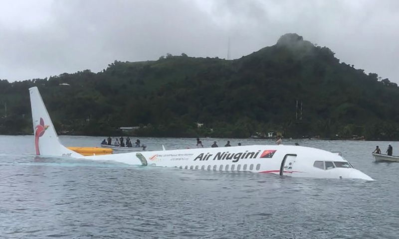 Majuro : Passengers were forced to swim for their lives yesterday when an airliner ditched into a lagoon after missing the runway on a remote Pacific island and began sinking. The Air Niugini Boeing 737-800 was attempting to land at Weno airport in Micronesia but ended up half submerged in Chuuk lagoon after the accident on Friday morning. Within minutes, locals scrambled a flotilla of small boats to pluck the 35 passengers and 12 crew from the water. The airline said the plane, which was involved in a collision with another aircraft earlier this year, had “landed short of the runway”. Remarkably, it reported no serious injuries among those on the plane, which was making a scheduled stop on its way from the Micronesian capital Pohnpei to Port Moresby.