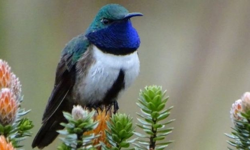 A team of ornithologists in Ecuador has identified a new species of hummingbird: a lovely blue-green creature that lives in a cold, barren highland area and is in danger of extinction. Team leader Francisco Sornoza saw one of the birds through binoculars a year ago and had a hunch that it was a previously unknown species. The bird is about 11 cm (four inches) long and has a stunning, deep blue neck, a white breast with a black stripe and greenish-blue head and body feathers.