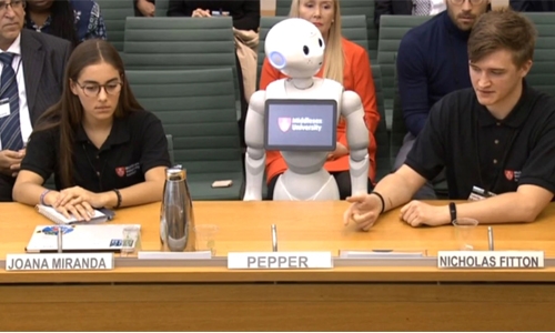A walking and talking robot appeared in Britain’s parliament for the first time yesterday, prompting Twitter users to seize the chance to heap more mockery on Theresa May. The latest round of public amusement at the expense of the British premier came during a committee hearing on artificial intelligence (AI) and “the fourth industrial revolution”. MPs on the education committee invited a robot named Pepper -- a white female creation with an excruciatingly thin waist and a tablet computer stuck to her chest -- to answer some basic questions.
