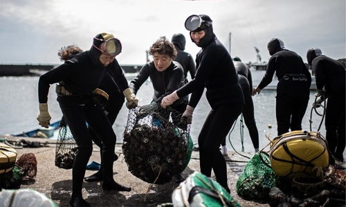 During the diving season, which lasts for 10 months a year, the local fishing association scrutinises weather forecasts and information on marine stocks each day, before issuing a call for the women from loudspeakers. Each ama -- which means “woman of the sea” -- has only rudimentary equipment: a buoyant ring to signal her presence at the surface while she dives, and a net to hold her haul. Out at sea, the women set up their rings and then dip beneath the surface, sometimes holding their breath for more than a minute. They tirelessly resurface and dive over and over, dozens of times a session.