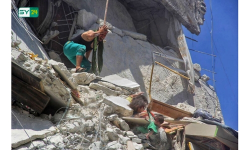 The picture went viral on social media networks: two dust-covered Syrian girls, trapped in rubble, grab their baby sister from her shirt as she dangles from a bombedout building. Behind them, a man slaps his hand against his forehead, his mouth gaping in horror as he looks on amid the mangled wreckage. The picture was captured on Wednesday by Bashar alSheikh, a photographer working with local news website SY24, moments after warplanes pummelled the town of Ariha in Syria’s northwestern province of Idlib.
