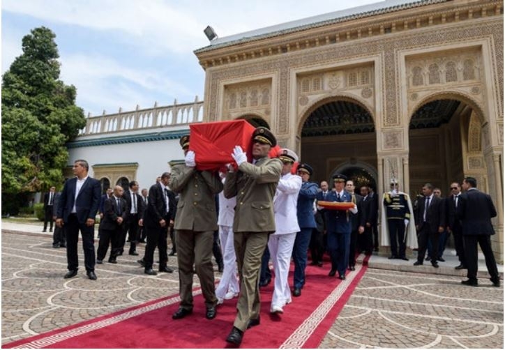 French President Emmanuel Macron and other foreign leaders also travelled to Tunisia to pay their last respects. Thousands of Tunisians mourners lined the 20-kilometre (12-mile) road from the presidential palace in Carthage, where the body was laid in state, to the Djellaz cemetery in southern Tunis where Essebsi was buried. Officers in full uniform carried the coffin draped in the Tunisian flag into a ceremonial room at the Carthage palace packed with dignitaries, placing it on a dais.