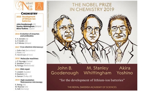 Three researchers won the Nobel Chemistry Prize on Wednesday for the development of lithium-ion batteries, paving the way for smartphones and a fossil fuel-free society. John Goodenough of the United States -- at 97 the oldest person to be awarded a Nobel prize -- Britain’s Stanley Whittingham, and Japan’s Akira Yoshino will share the nine million Swedish kronor (about $914,000 or 833,000 euros) prize equally, the Royal Swedish Academy of Sciences said.